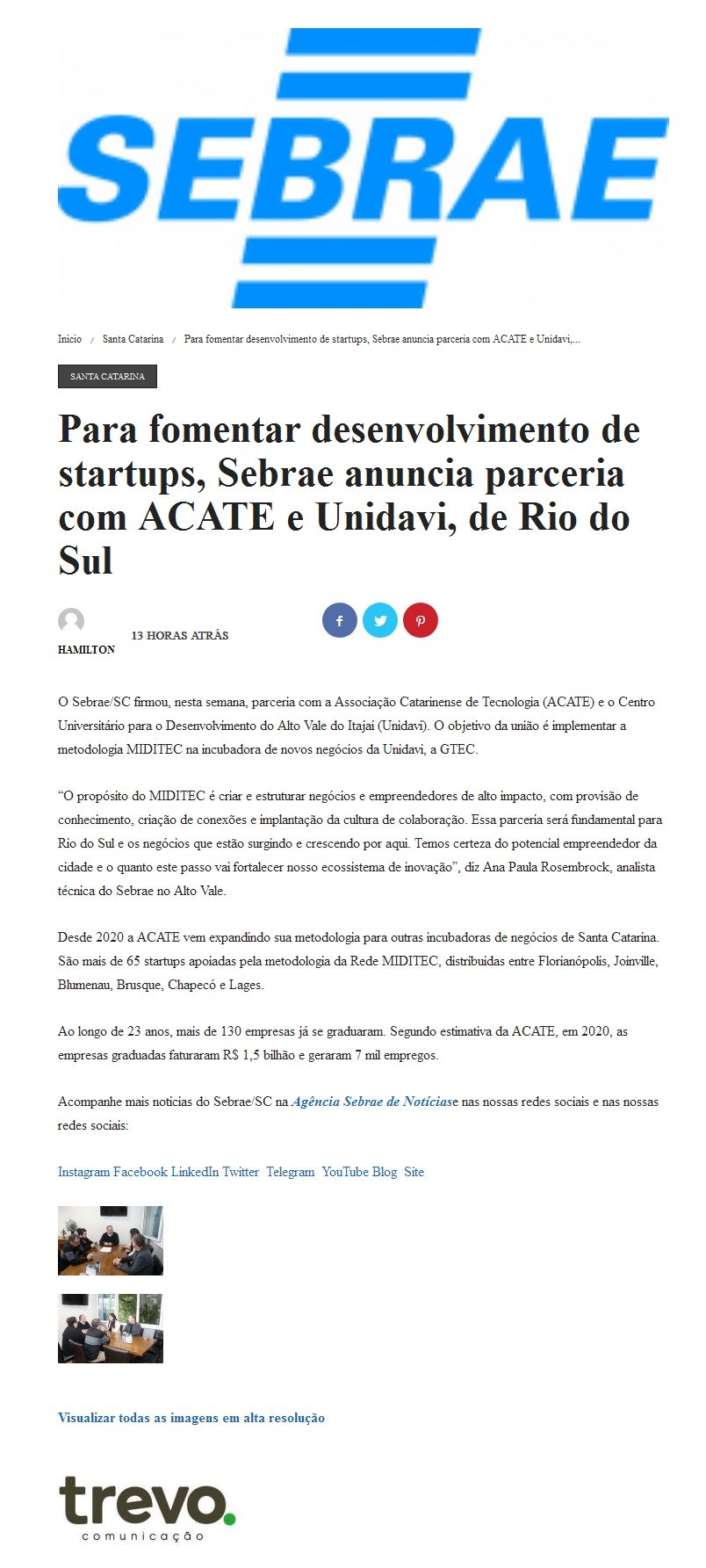 Para fomentar desenvolvimento de startups, Sebrae anuncia parceria com ACATE e Unidavi, de Rio do Sul