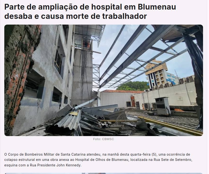 Parte de ampliação de hospital em Blumenau desaba e causa morte de trabalhador