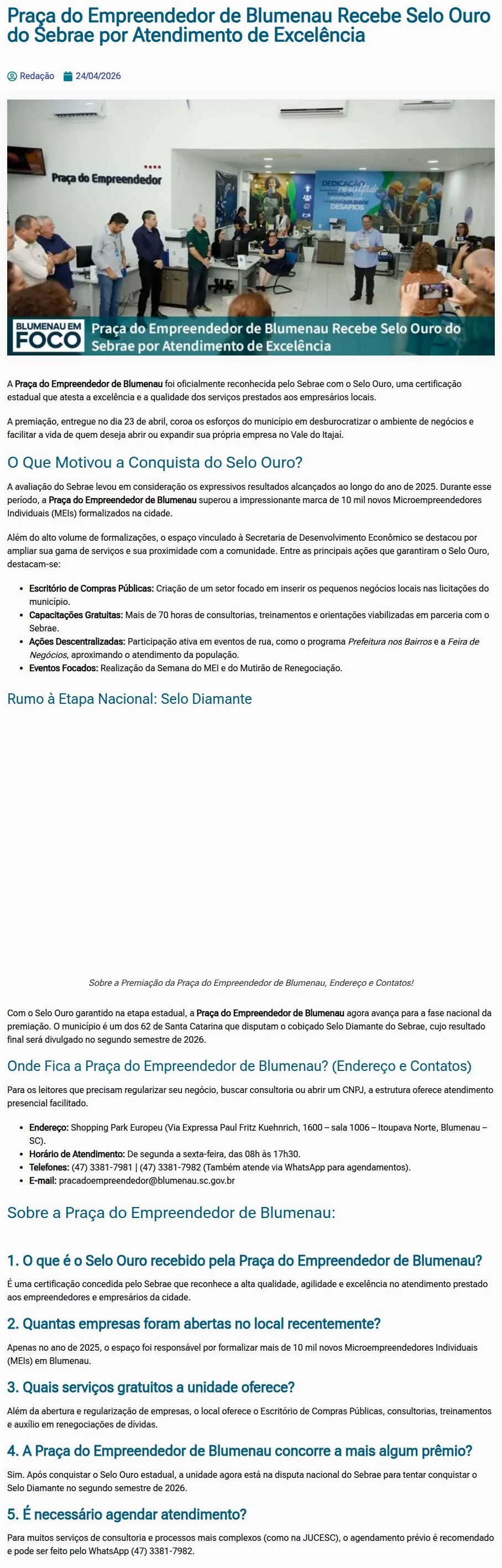 Praça do Empreendedor de Blumenau ganha Selo Ouro por qualidade de atendimento