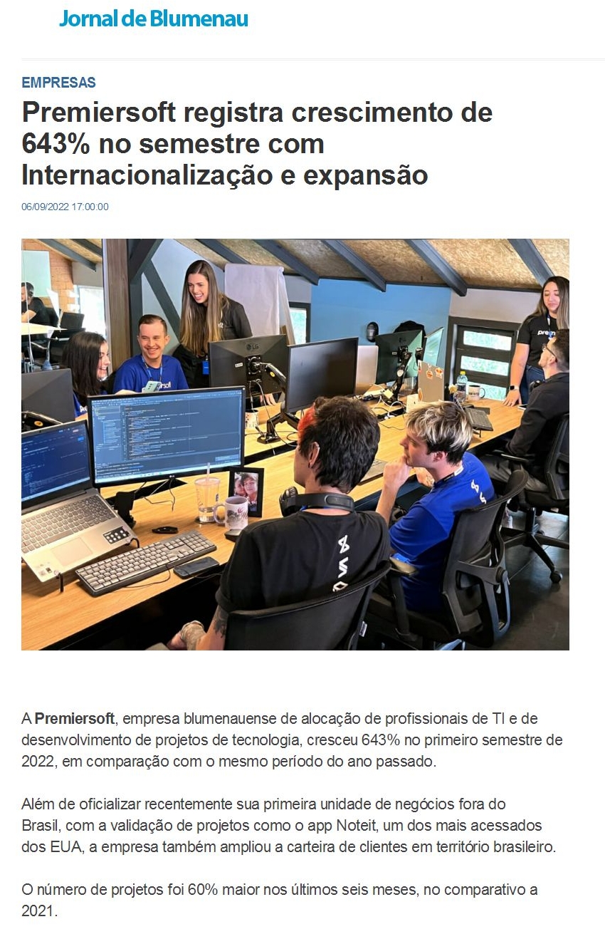 Premiersoft registra crescimento de 643% no semestre com Internacionalização e expansão | Jornal de Blumenau