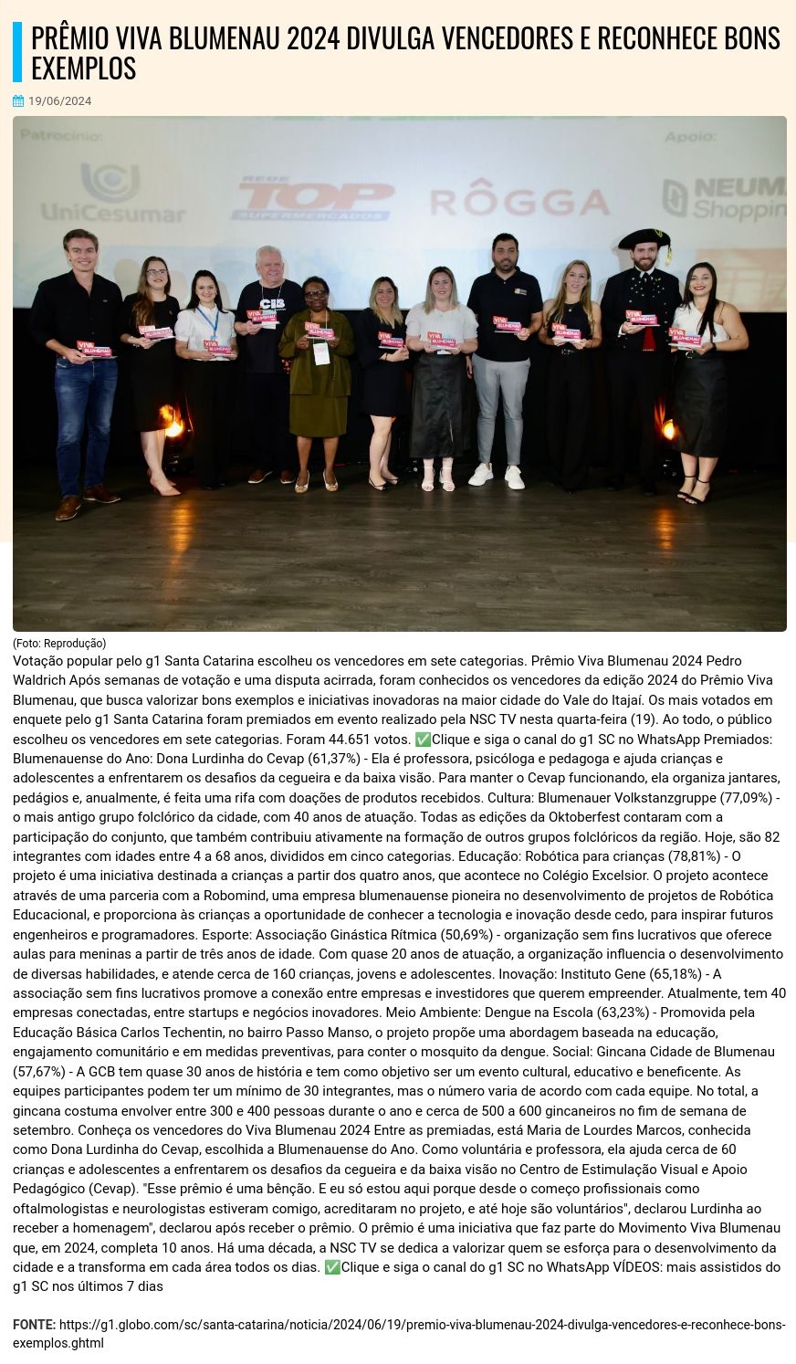 Prêmio Viva Blumenau 2024 divulga vencedores e reconhece bons exemplos Radio NaMorada dos Montes