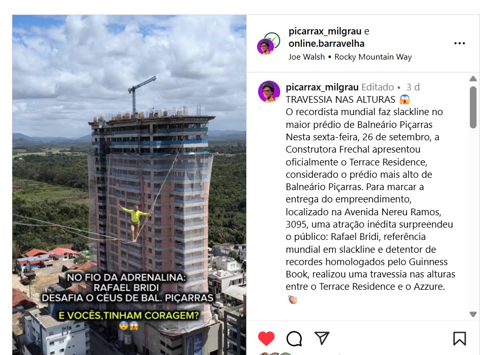 Rafael Bridi realiza travessia de slackline nas alturas, em Piçarras, em ação com a Frechal Empreendimentos