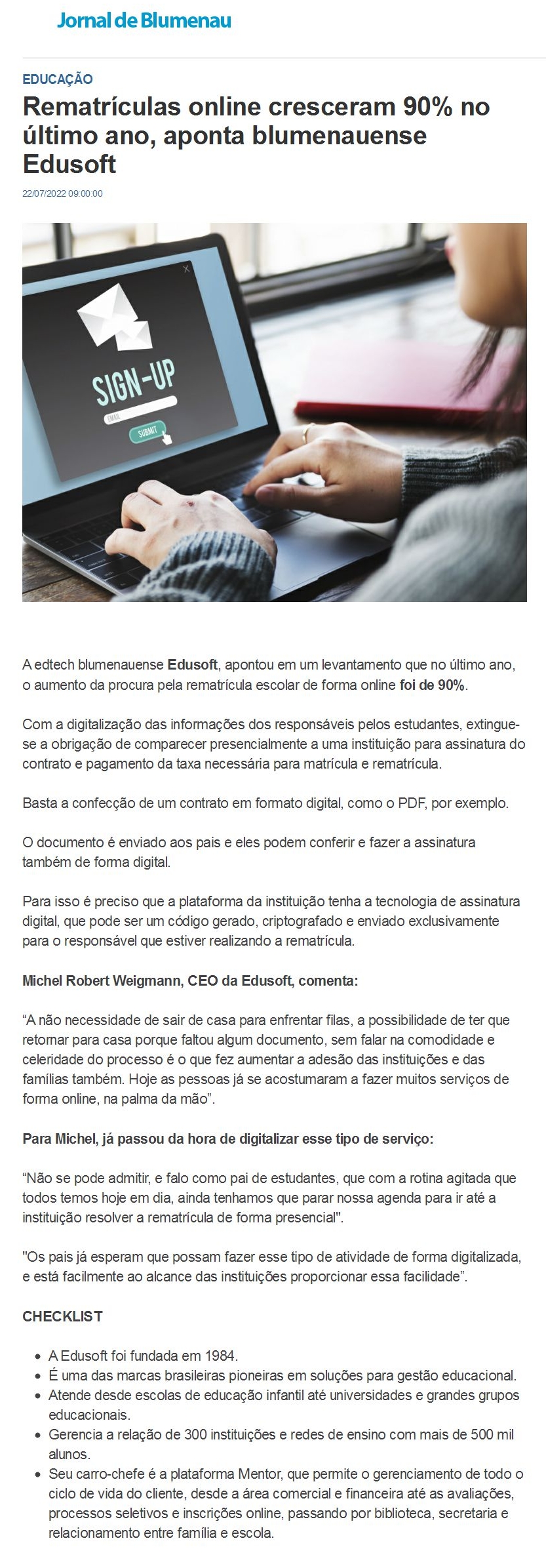 Rematrículas online cresceram 90% no último ano, aponta blumenauense Edusoft | Jornal de Blumenau