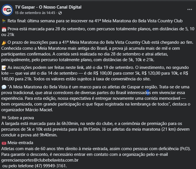 Reta final: últimas semanas para se inscrever na 41ª Meia Maratona do Bela Vista Country Club