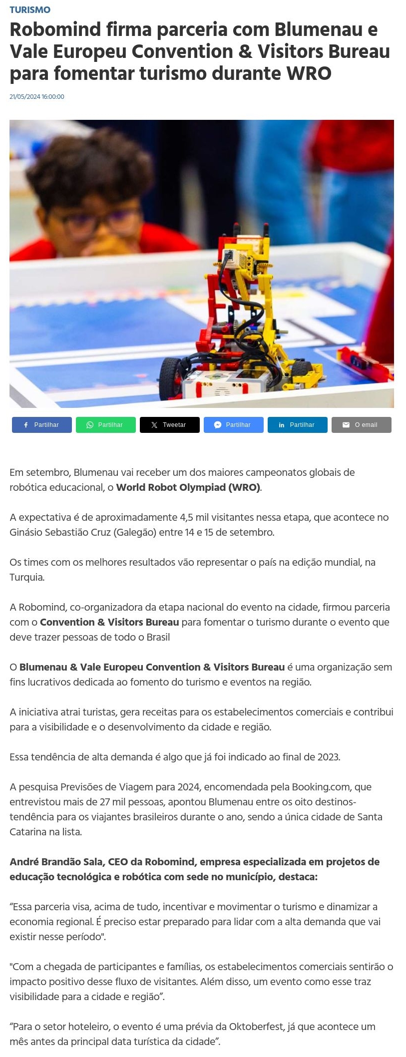Robomind firma parceria com Blumenau e Vale Europeu Convention & Visitors Bureau para fomentar turismo durante WRO Noticenter
