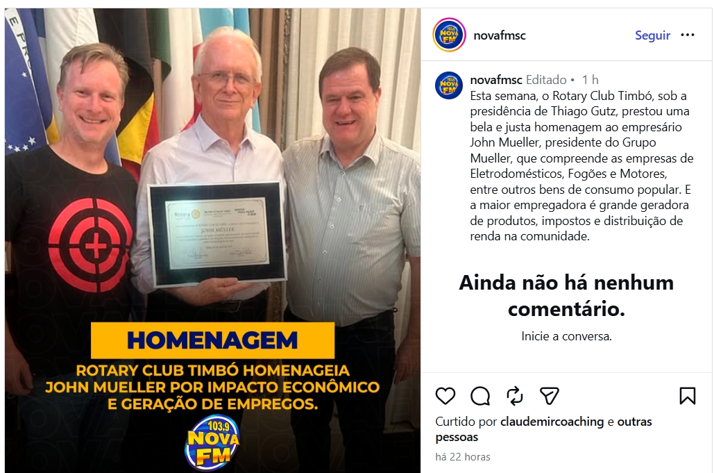 Rotary Club Timbó homenageia John Mueller por impacto econômico e geração de empregos