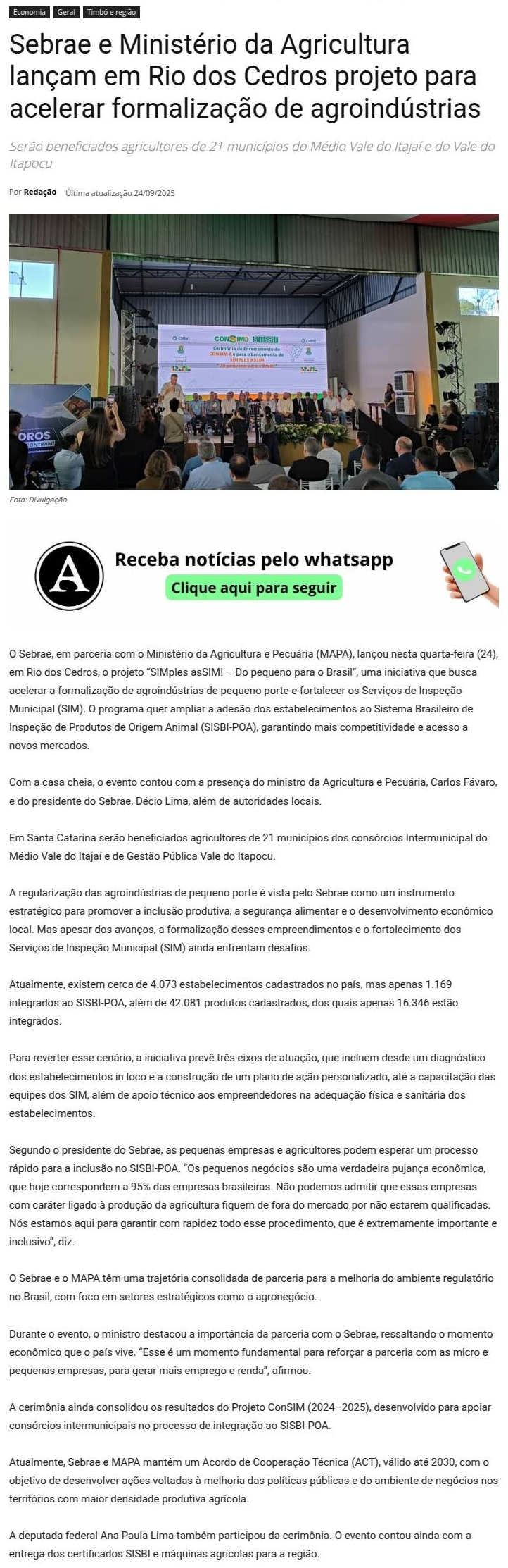 https://oauditorio.com/cidades/timbo-e-regiao/09/2025/sebrae-e-ministerio-da-agricultura-lancam-em-rio-dos-cedros-projeto-para-acelerar-formalizacao-de-agroindustrias