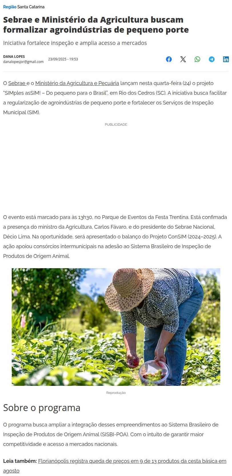 Sebrae e MAPA lançam em SC projeto para acelerar formalização de agroindústrias