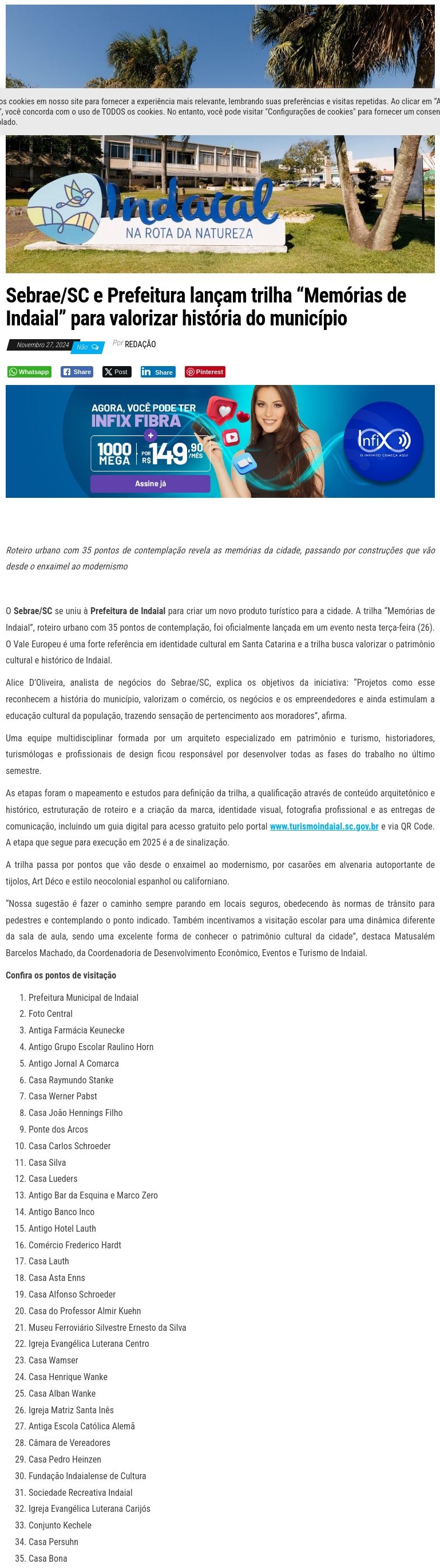 Sebrae/SC e Prefeitura lançam trilha "Memórias de Indaial" para valorizar história do município