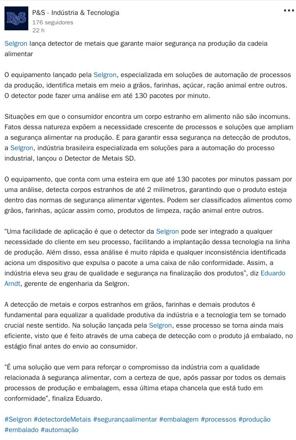 Selgron lança detector de metais que garante maior segurança na produção da cadeia alimentar