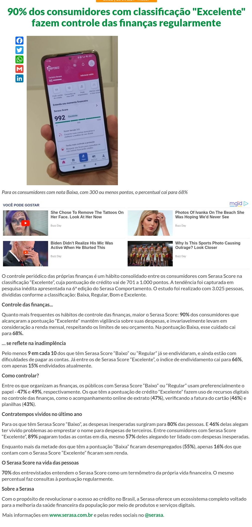 Serasa Score: 90% dos consumidores com classificação "Excelente" fazem controle das finanças regularmente