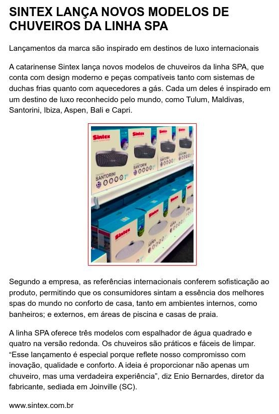 SINTEX LANÇA NOVOS MODELOS DE CHUVEIROS DA LINHA SPA