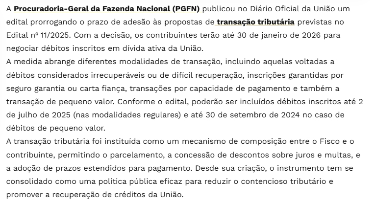 Transação tributária: prorrogação da PGFN amplia oportunidades até 2026