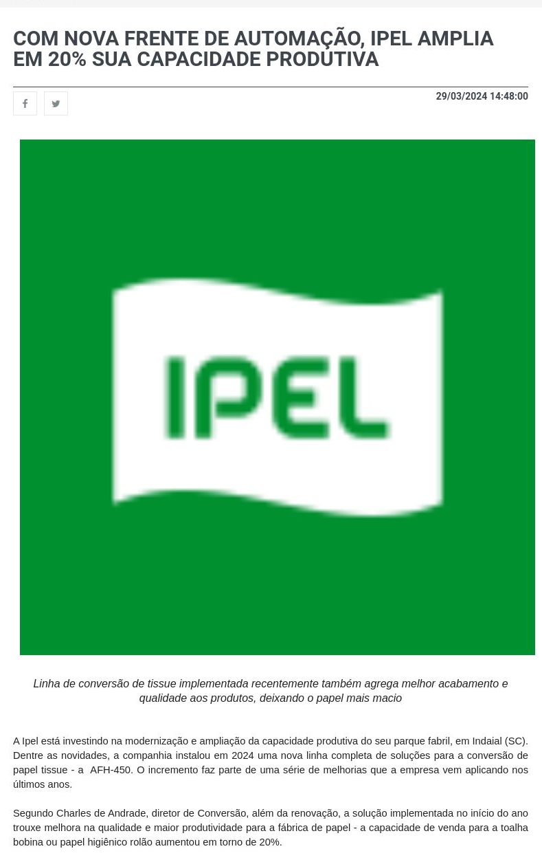 Vale Alternativo - Com nova frente de automação, Ipel amplia em 20% sua capacidade produtiva