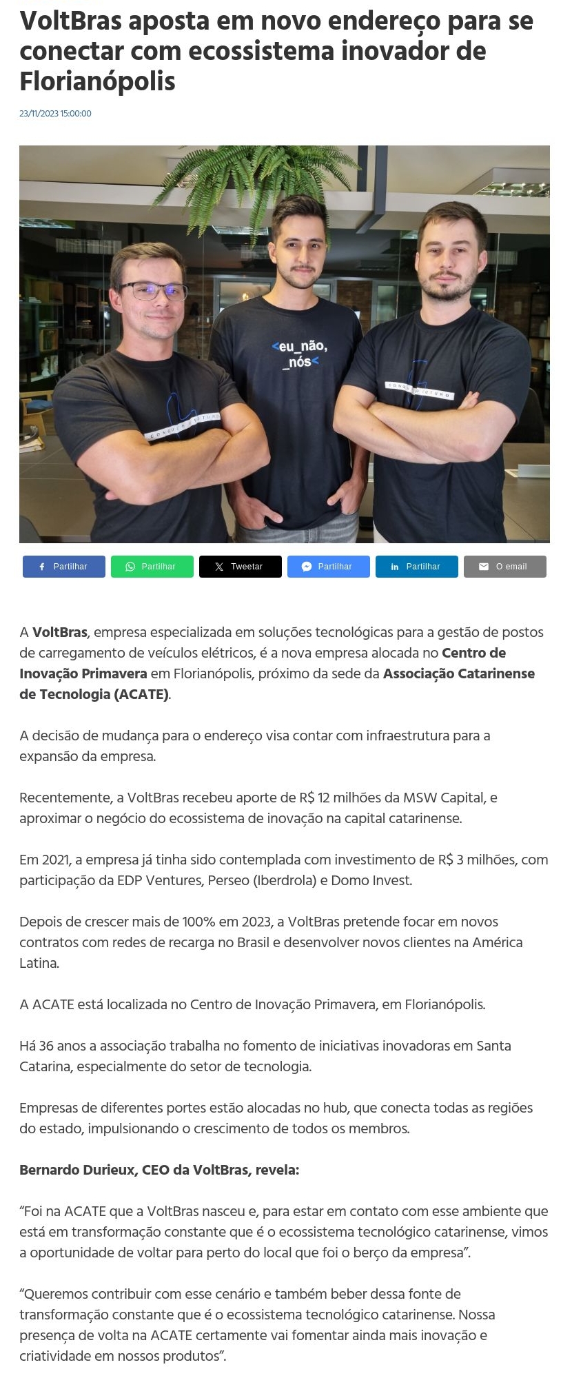VoltBras aposta em novo endereço para se conectar com ecossistema inovador de Florianópolis | Noticenter