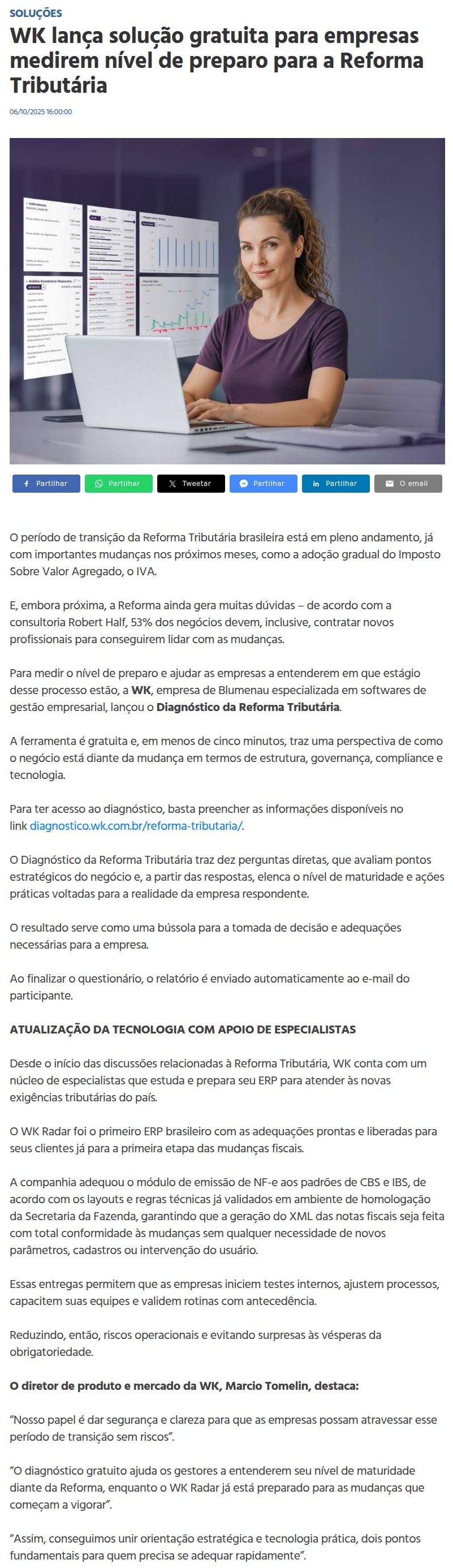 WK lança solução gratuita para empresas medirem nível de preparo para a Reforma Tributária Jornal de Blumenau