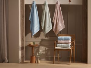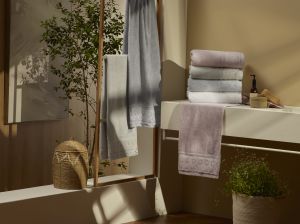 No banho, os lançamentos seguem a mesma lógica de valorização dos detalhes. A Toalha Combinatto reúne fio penteado, barra aveludada e bordado decorativo, entregando boa absorção e maciez. Já a Toalha Marselle aposta no nobre fio de algodão egípcio, garantindo alta capacidade de absorção, maciez extra e transformando o pós-banho em um momento de conforto prolongado. O grande charme da peça é o seu barrado, que recebe uma delicada aplicação de renda do tipo bordado inglês.